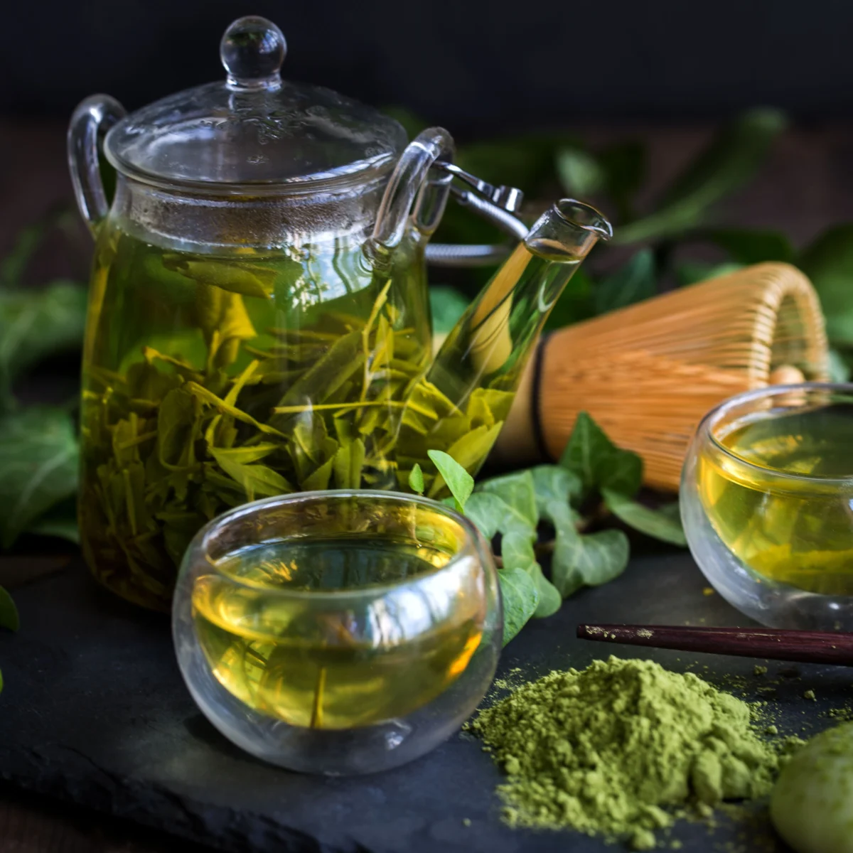 Dalam teh hijau mengandung kafein ringan dan katekin (antioksidan) yang bisa meningkatkan metabolisme dan membantu mengontrol rasa lapar. Juga bisa mengurangi keinginan untuk ngemil karena efek menenangkan.
